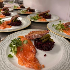 (Salmon gravadlax, beetroot tartare and micro cress)