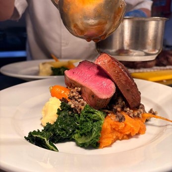 (Grilled venison steak, haggis, neeps and tatties with a apple cider juniper jus)